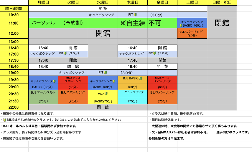 - クラス開始、終了時間は5分-10分ズレ込む場合あります。